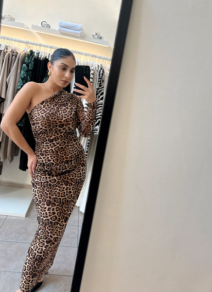 Φόρεμα maxi animal print τουλινό με έναν ώμο